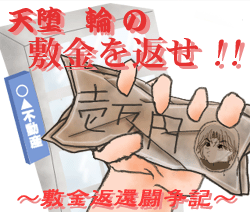 少しでも客から金を取ろうという思惑からこの敷金が利用され始めている。 だからこの敷金返還についてのトラブルは割と新しいトラブルであるので、 地域によっても、業者によってもその手口は多種多様である。 よってその全てを見据えてのマニュアルみたいなものは書けないが、 しかし天堕の経験から、少しでもトラブルについての解決の糸口を見つけて欲しいと思い、 体験談風のレポートと天堕の体験に基づいてのアドバイスを書く事にした。 それらが読んでくれた方のヒントにでもなってくれれば幸いである。 |